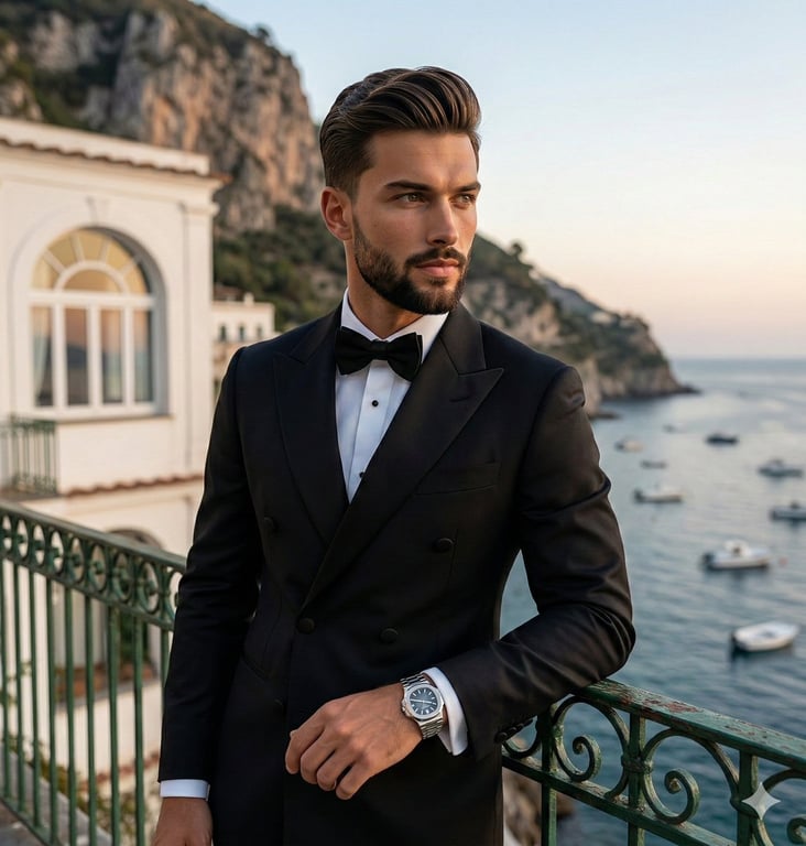 A detailed JSON prompt for generating a sophisticated, realistic portrait of an athletic man in a black tuxedo, set against an elegant Mediterranean twilight evening. The prompt meticulously defines the color palette, lighting (warm golden window light), composition (rule of thirds, focusing on the face and a silver luxury watch), and the overall mood, referencing Slim Aarons' style.