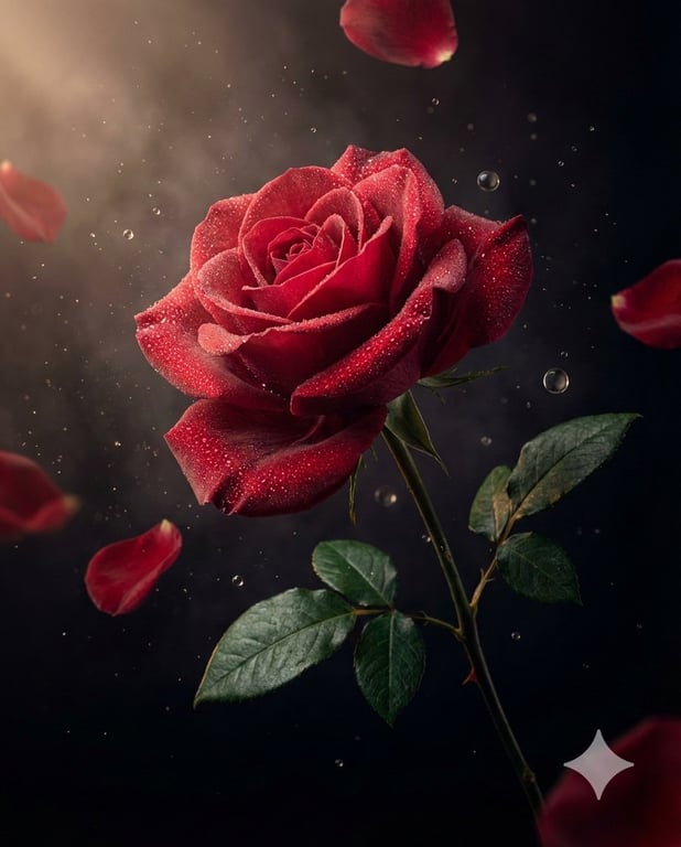 A highly detailed JSON prompt for generating an 8K hyper-realistic luxury commercial render of a velvet red rose in full bloom, emphasizing macro details, micro dewdrops, dramatic low-key studio lighting, and cinematic composition with floating particles.