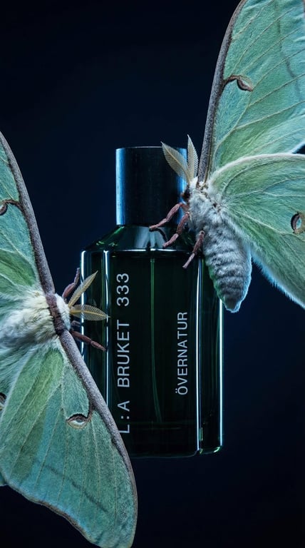 A prompt for generating a hyper-realistic product photograph of a luxury green glass perfume bottle floating in a dark, mystical forest at night, surrounded by glowing fireflies and luna moths, emphasizing cinematic lighting and glass reflections.
