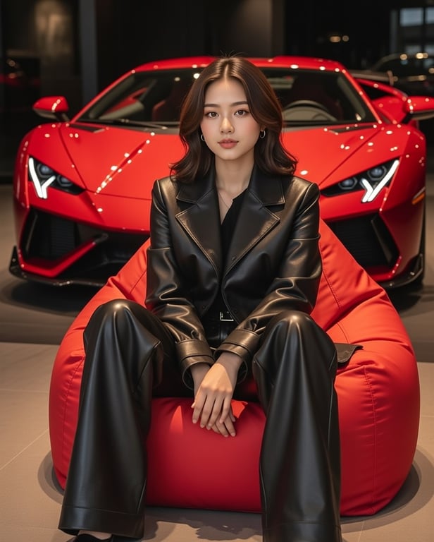 A JSON prompt for generating an image set in a dimly lit luxury showroom, featuring a bright red supercar and a subject seated on a red beanbag chair, wearing an all-black leather outfit to maximize color contrast.