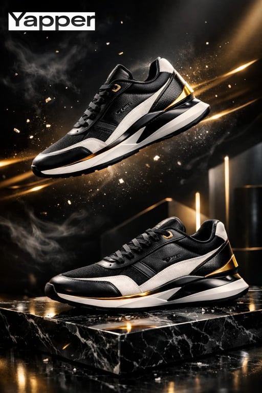 A detailed JSON prompt for generating ultra-premium cinematic product photography of luxury designer sneakers, focusing on materials (Italian leather, carbon fiber), dramatic lighting (strong rim lighting), and composition (floating above a glossy black marble platform).