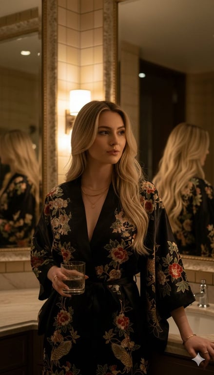 A detailed JSON prompt for generating a photorealistic portrait of a woman in a luxury Tokyo hotel bathroom. It specifies a 35mm film aesthetic, warm tungsten lighting, and a black silk kimono with intricate Japanese embroidery.