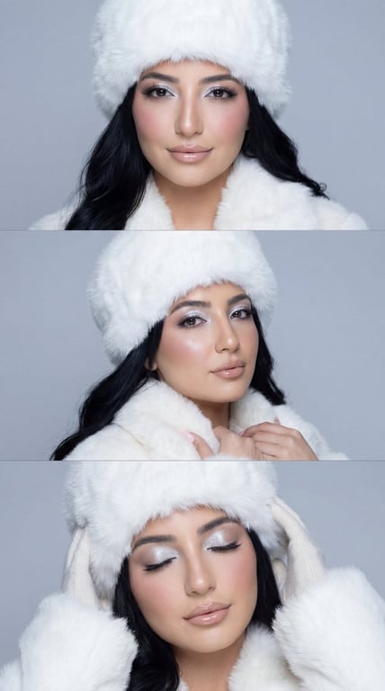 A highly structured JSON prompt for an image-to-image generation task, focusing on creating a luxury winter couture beauty editorial portrait. It requires preserving the identity and facial features of a reference image while applying specific high-fashion styling, makeup, lighting (soft diffused key light, subtle rim light), and color grading (ivory, soft gray, cool pink) for a cold luxury elegance mood.