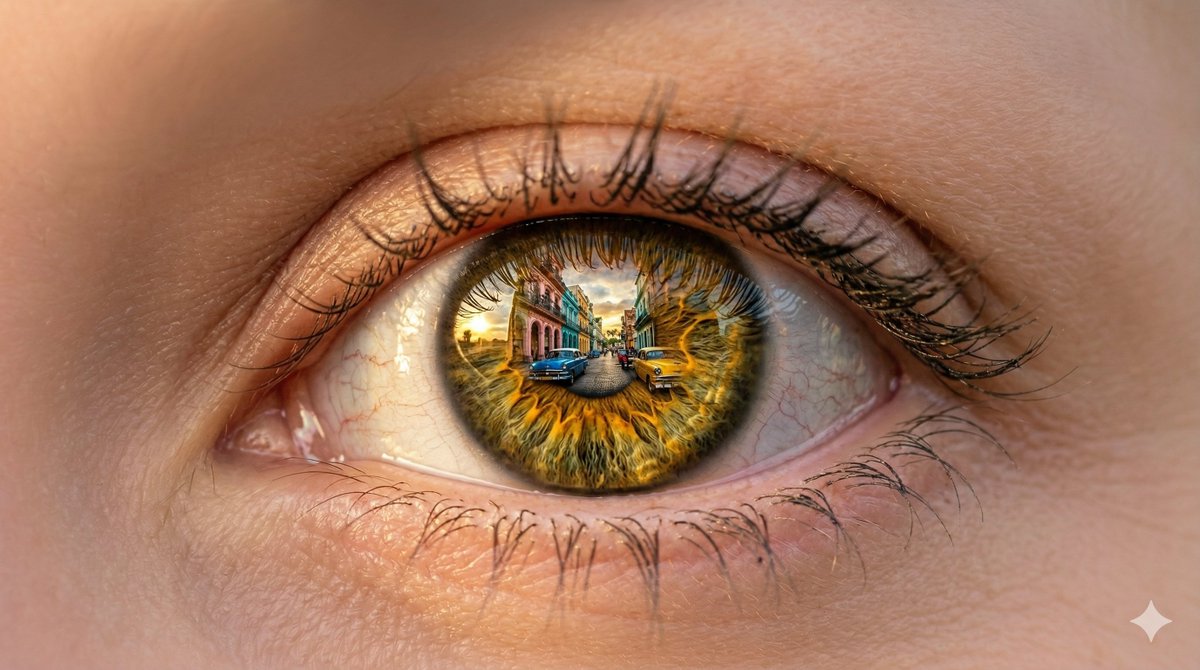 A highly specific Nano Banana Pro prompt for generating an extreme macro close-up of a hazel eye, where the iris reflects a hyper-detailed miniature Havana street scene at sunset, emphasizing photorealistic details like skin micro-texture, individual eyelashes, and professional Hasselblad camera settings.