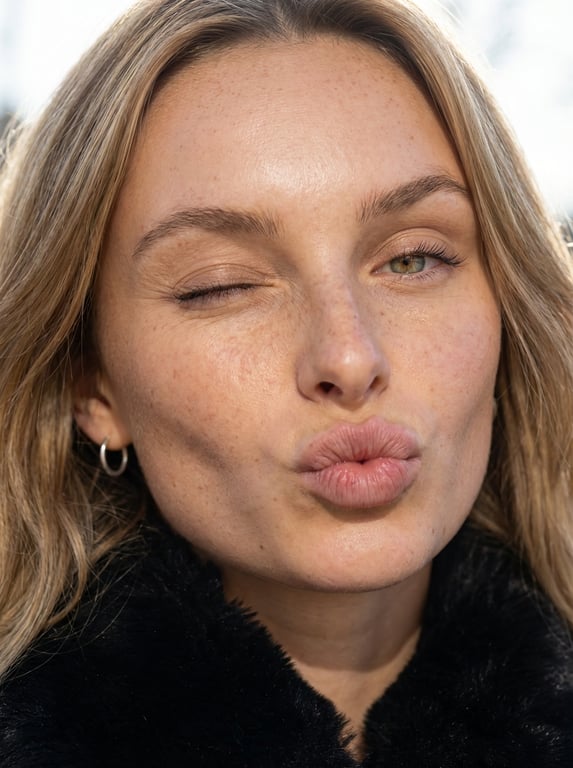 A highly detailed, technical prompt for generating an 8K macro portrait focusing on the face of a young woman executing a deliberate wink and a puckered pout, emphasizing hyper-visible skin texture, natural irregularities, and asymmetrical facial compression, using ControlNet for feature lock.