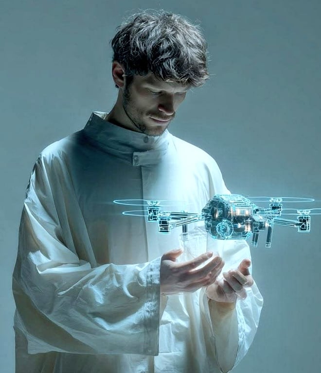 A prompt for generating a futuristic, realistic image of a European man in a technical lab coat holding a transparent hologram of a detailed drone hovering in mid-air, emphasizing high contrast illumination and 8k resolution.
