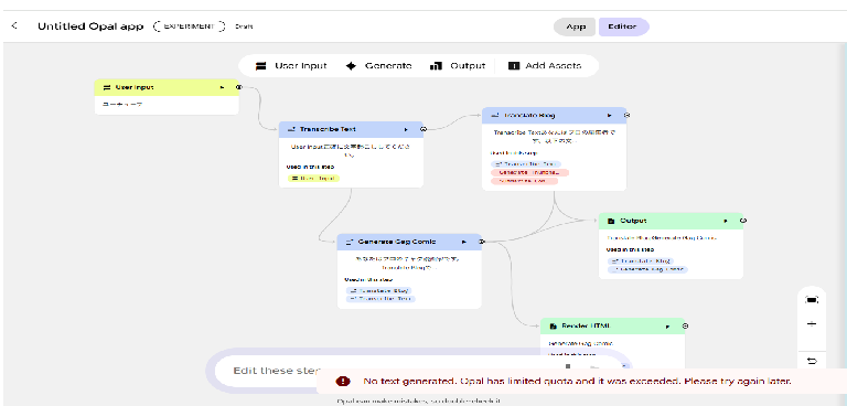 A prompt used within Google's Opal to instruct the LLM to create the structural composition (storyboard/layout) for a 4-panel manga, which is then passed to Nano Banana Pro for actual image generation.