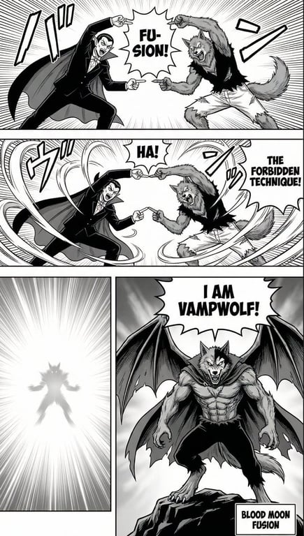 A simple prompt for generating a manga page illustration showing two user-defined characters performing the Dragon Ball Z fusion technique and revealing their combined form.