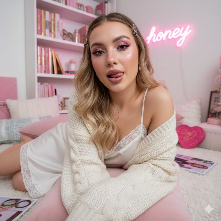 A highly descriptive prompt for generating a hyper-realistic, playful portrait of a young woman in a maximalist 'clean girl' aesthetic setting. The subject is lounging on floor pillows, wearing a chunky cream cable-knit cardigan, and making a 'blep' expression. The environment includes a color-organized bookshelf, a neon pink 'honey' sign, and high-key, diffused lighting.