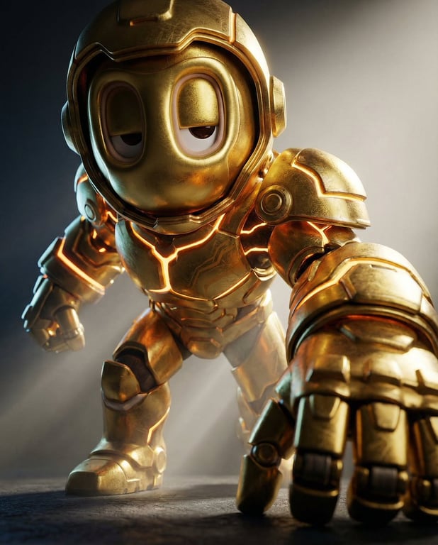 A highly technical prompt for generating a cinematic power reveal of a character fully re-engineered in advanced mech armor, with critical instructions to preserve the exact original facial geometry, eye shape, and color palette, using a worm's-eye ultra-low angle.