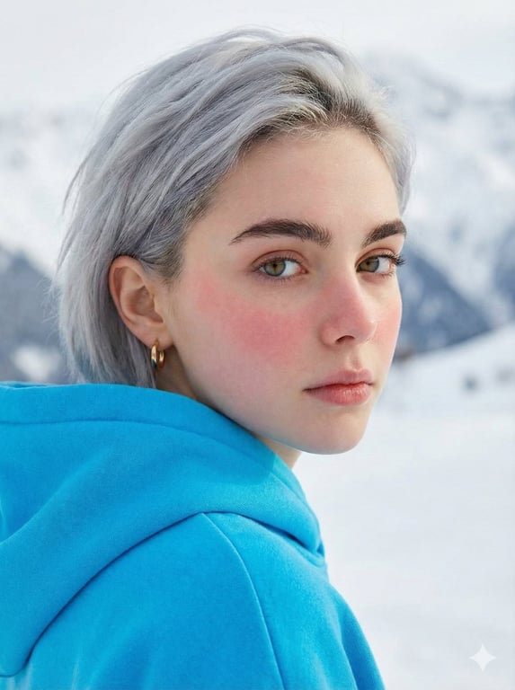 A partial JSON prompt for generating a portrait of a young woman looking back over her shoulder with a calm, slightly melancholic expression, emphasizing fair skin, rosy cheeks, and sharp focus on her hazel-green eyes.