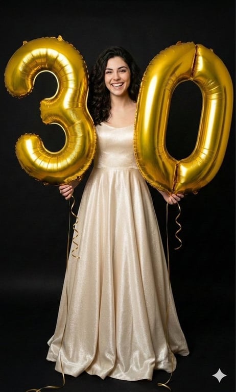 A prompt for generating a photorealistic studio portrait of a young woman holding large metallic gold foil balloons, emphasizing bold colors, soft studio lighting, and a celebratory atmosphere. It requires a reference image for the subject's appearance.