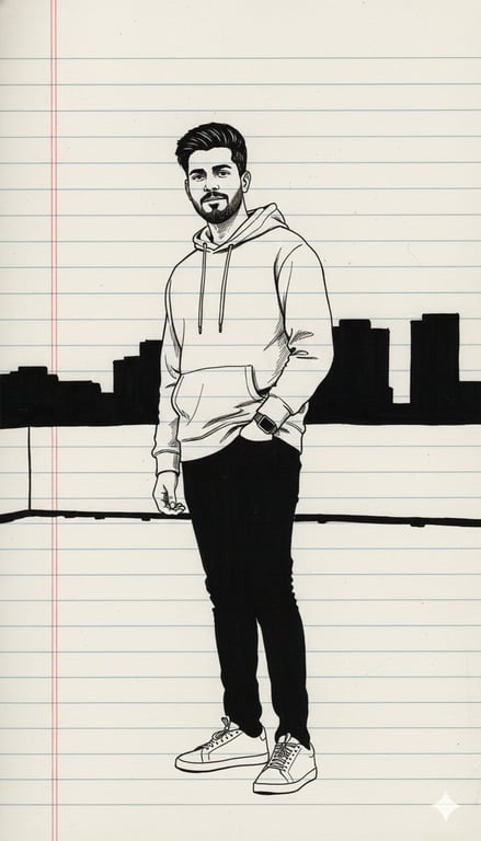 A JSON prompt designed to convert an uploaded image into a minimal black ink, full-body illustration style. The output should resemble a moody, artistic drawing created with bold, heavy strokes on plain notebook paper, rendered in 4K resolution.