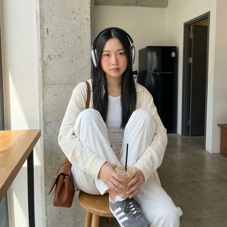 A structured prompt for generating an editorial-style, highly realistic image of a young woman sitting casually indoors in a modern minimalist setting. It specifies natural daylight, neutral color palette, and a medium full-body shot.