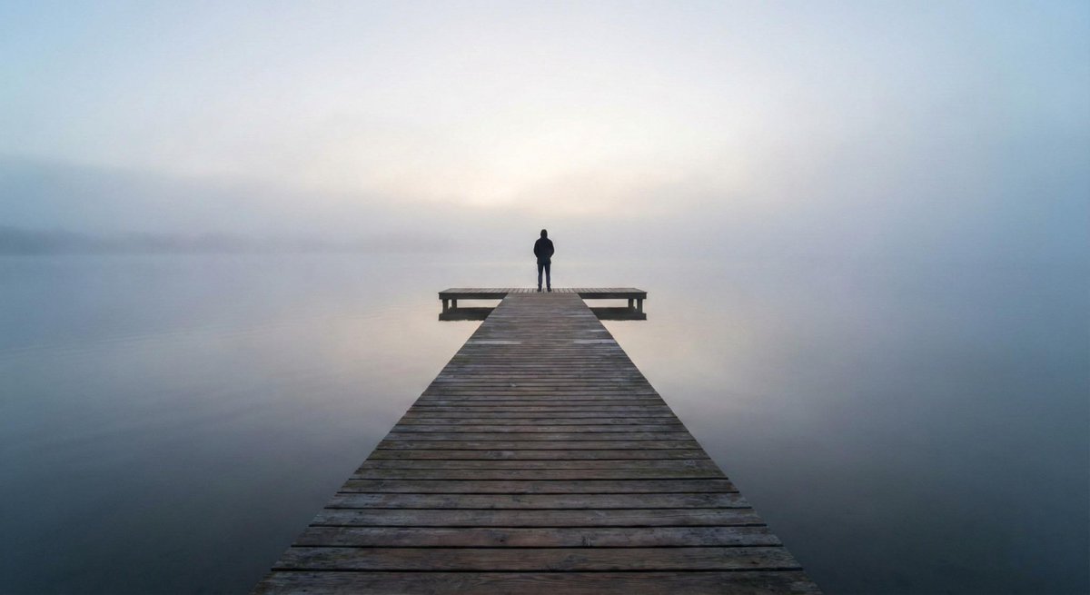 A direct Nano Banana Pro image prompt for a minimal, realistic dawn scene of a lone person on a pier, ideal for atmospheric or emotional key art.