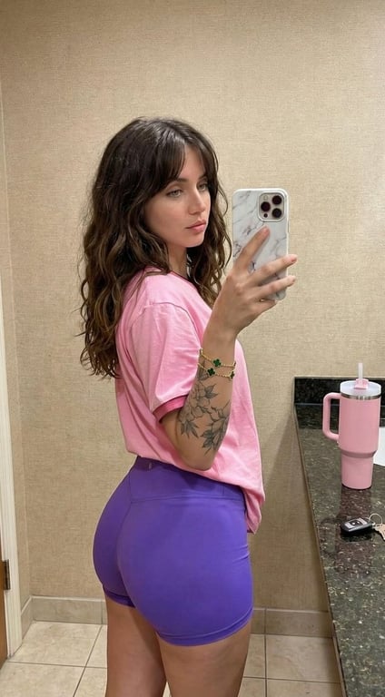 A highly detailed prompt specifying the subject's appearance (hair, tattoo, clothing) and the objects in the scene (phone, Stanley-style tumbler, keys) for generating a realistic mirror selfie image in a bathroom or dressing room setting.
