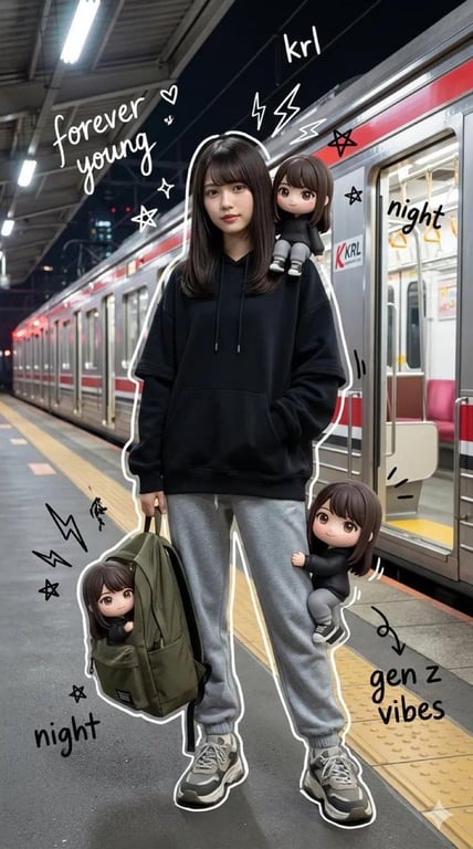A complex prompt for Nano Banana Pro that generates a mixed-media image: a hyper-realistic portrait of a Gen Z teenager (using an uploaded photo) on a train platform at night, surrounded by cute 3D chibi versions of themselves, overlaid with hand-drawn doodle effects and text.