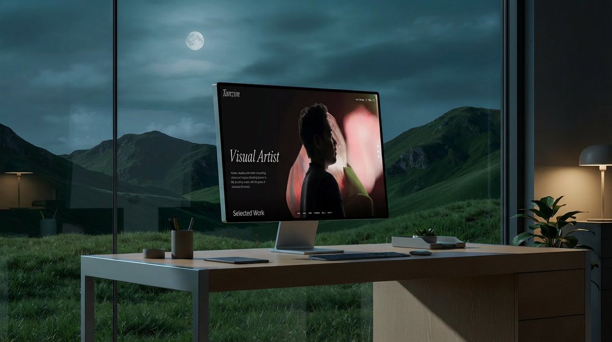 A prompt designed for creating high-quality mockups by instructing the AI to place a website image (second photo) onto the screen of a computer (first photo), replace the background to match the website's aesthetic, and change the table material.