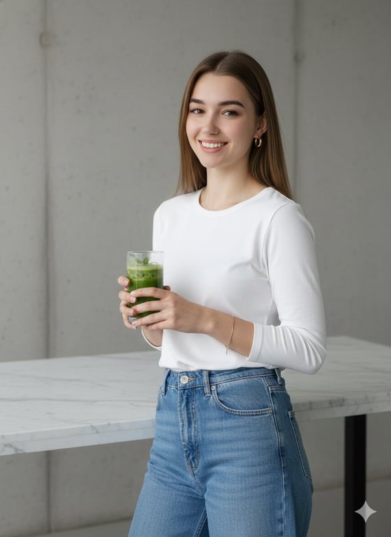 A structured Nano Banana Pro prompt for generating a photorealistic, contemporary lifestyle portrait of a woman. It mandates strict identity preservation using a reference image, focusing on a clean, modern aesthetic (marble countertop, concrete wall), soft lighting, and specific wardrobe details (full white shirt, wide-leg jeans).