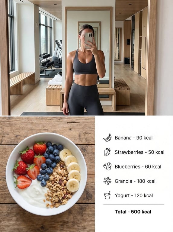 A highly detailed structured JSON prompt for Nano Banana Pro designed to create a split composition poster. The top section features a luxurious smartphone gym selfie of a fit woman, and the bottom section displays a healthy diet bowl with a clean calorie infographic, emphasizing a modern fitness lifestyle aesthetic.