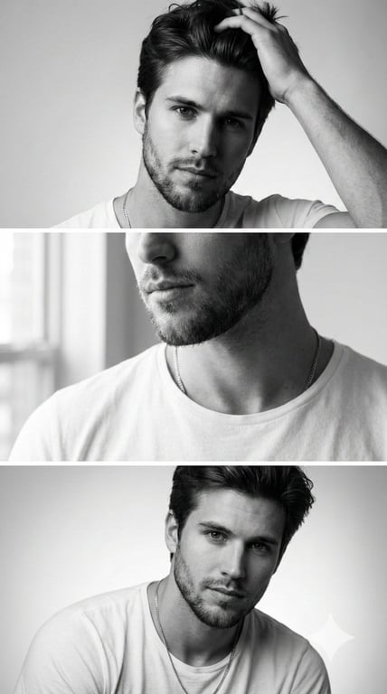 A highly structured prompt for generating a three-panel monochrome fashion editorial triptych featuring a male model, inspired by modern sculpture aesthetics, with detailed lighting and composition specifications.