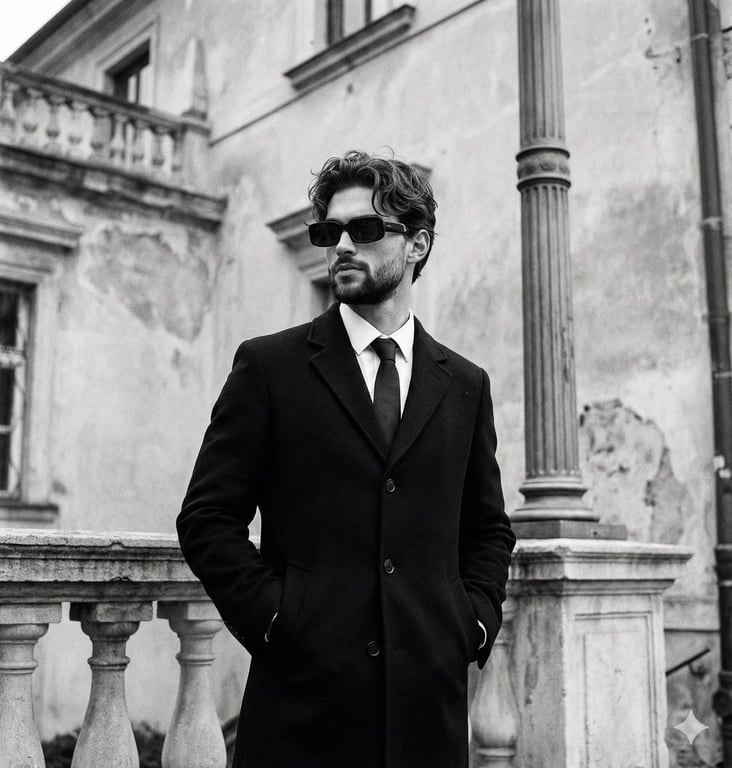 A highly detailed, structured JSON prompt for generating a high-contrast, monochromatic editorial photograph of a stylish man. It meticulously defines composition, lighting (natural window light), color profile (black and white), and technical specifications like film grain and low angle perspective.