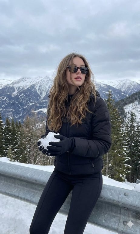 A prompt for generating an outdoor portrait of a young woman in a snowy, mountainous setting, dressed entirely in black technical wear, holding snow, under a cloudy sky, conveying a cold, atmospheric mood.