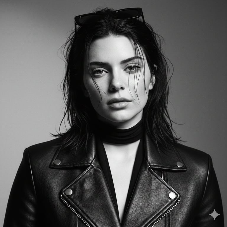 A highly detailed, structured JSON prompt for Nano Banana Pro to generate a high-end, monochrome magazine cover portrait of Billie Eilish. It specifies facial geometry, moody atmosphere, wet-look hair, black leather wardrobe, and precise studio lighting and camera settings (85mm, f/1.8 look).