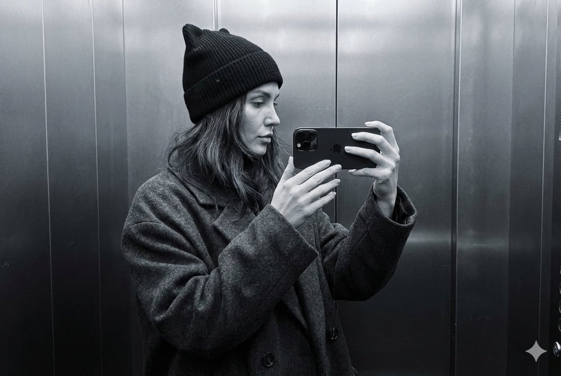 A prompt for generating a photorealistic, minimalist, and moody monochrome profile selfie. The scene is set in an elevator mirror, focusing on the textures of the oversized coat and knit cat-ear hat, with soft diffused lighting and a cool color scheme.