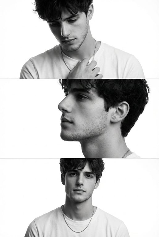 A prompt for generating a minimalist monochrome fashion editorial triptych (three stacked cinematic frames) of a young man, focusing on preserving the model's features from a reference image, and utilizing Rembrandt lighting to highlight bone structure and masculine elegance.