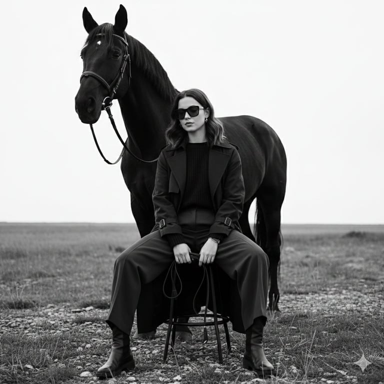 A detailed prompt for Nano Banana Pro on Gemini app, generating a monochrome fine-art fashion editorial photograph featuring a woman with wavy hair, dark sunglasses, and oversized clothing, sitting on a metal stool with a strong black horse standing closely behind her in an open natural landscape. The prompt emphasizes preserving the face from a reference image.