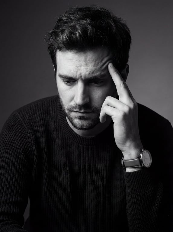 A highly detailed JSON prompt for generating a dramatic, monochrome fine art portrait of a man. It specifies low-key studio lighting, high contrast, a pensive pose (hand raised to temple), and a tight medium close-up composition, emphasizing the introspective mood and cinematic aesthetic.