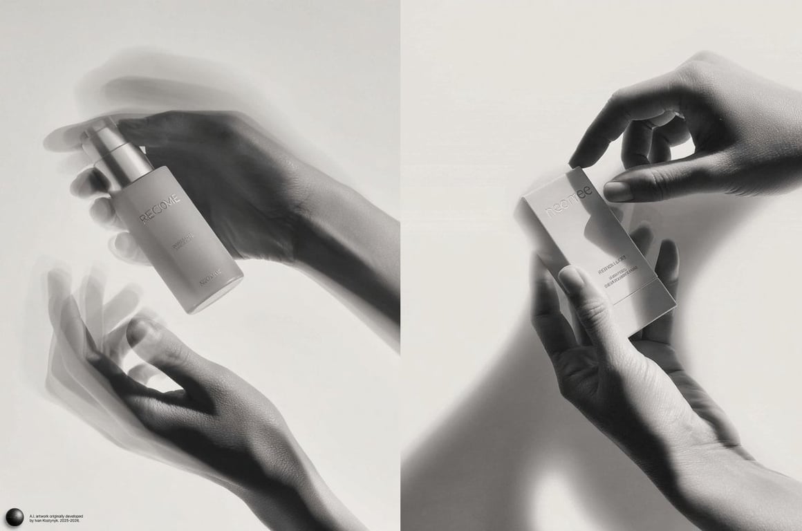 A detailed prompt for generating a high-end, minimalist beauty editorial image featuring a skincare bottle held by hands, using monochrome color, motion blur effects (ghosting/multi-exposure) to convey kinetic energy, and soft, high-key studio lighting.
