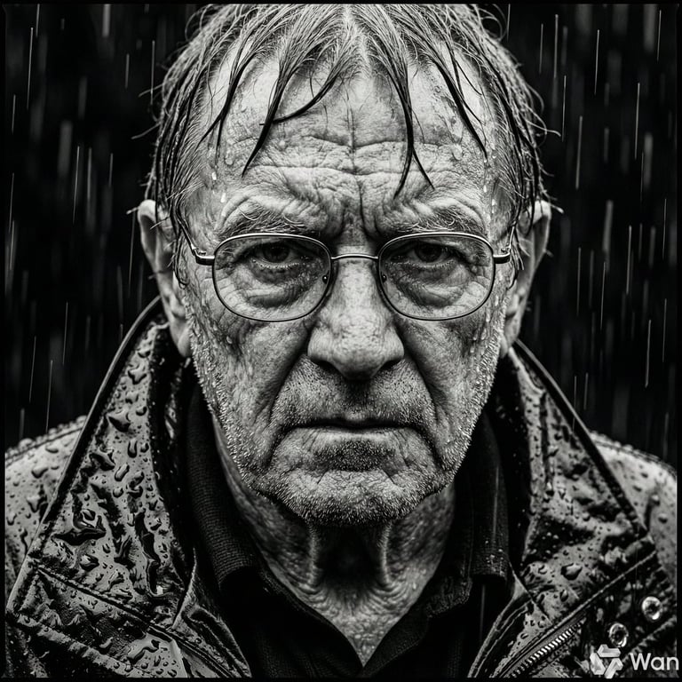 A detailed prompt for generating a high-contrast, gritty monochrome close-up portrait of an elderly man drenched in heavy rain, using specific camera and film emulation settings (Leica M11, Ilford HP5) in the style of Sebastiao Salgado.