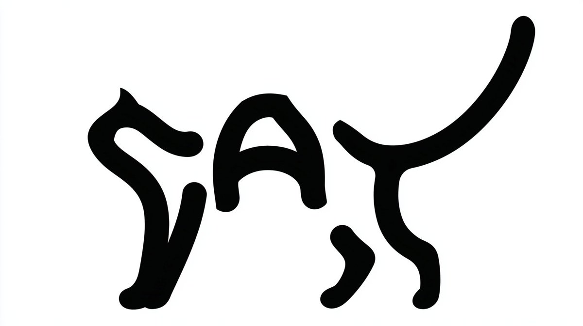 A detailed prompt used across multiple models, including Nano Banana Pro, to generate an artistic monochrome typographic illustration where the single word 'CAT' is sculpted into the silhouette of a stretching domestic cat, emphasizing elegant form and minimal composition.
