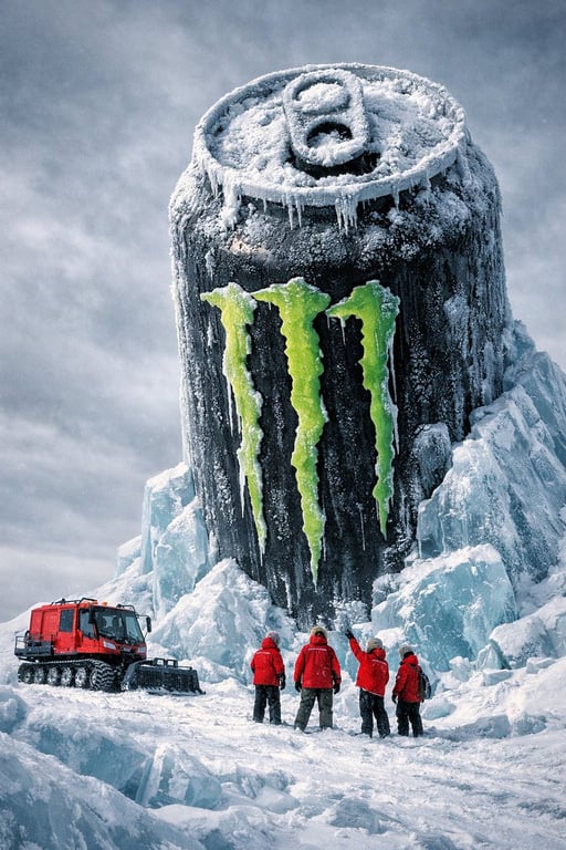A structured JSON prompt for Nano Banana Pro and GPT Image 1.5 to generate a cinematic, ultra-realistic image of a massive, monumental Monster Energy can partially frozen in the Arctic. The prompt specifies the environment (ice, snow), scale reference (Snowcat, scientists in red parkas), low-angle perspective, and technical rendering details (8k, HDR, ultra-detailed textures).