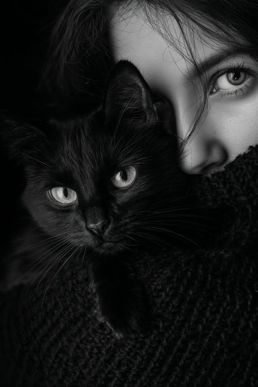 A prompt for generating a moody, artistic black-and-white portrait of a woman holding a black cat close to her face, emphasizing dramatic contrast, sharp focus on the woman's eye, and soft texture.