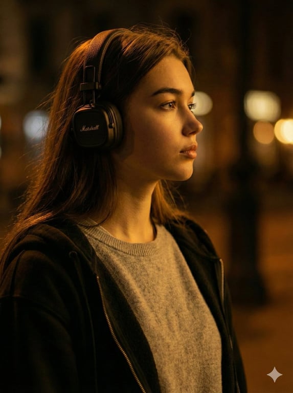 A detailed prompt for generating a moody, cinematic, and realistic candid profile portrait of a young woman wearing Marshall headphones, emphasizing rich warm amber lighting, dramatic low-key contrast, and an extremely shallow depth of field with foreground bokeh.