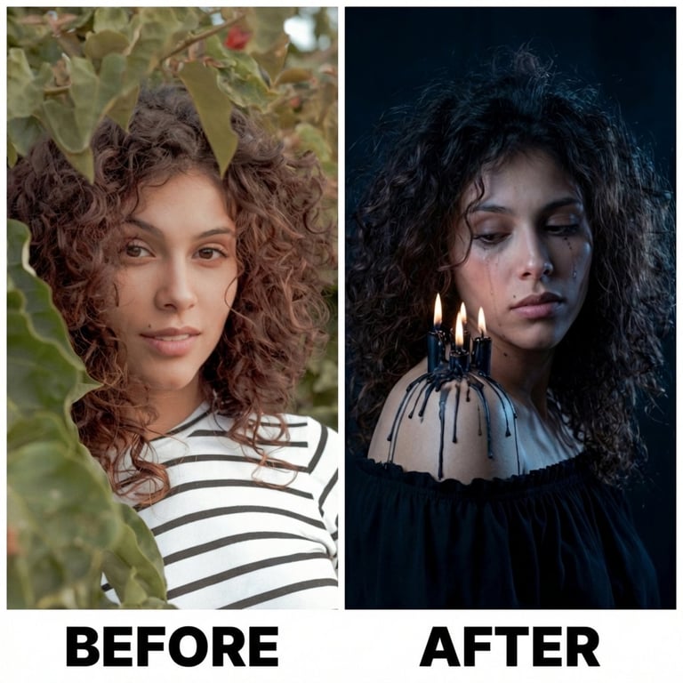 A prompt for creating a dark and moody portrait where the subject is wearing a black blouse with an exposed shoulder, upon which lit, melting black candles are dripping wax, conveying sadness and exhaustion under moonlight-style lighting.