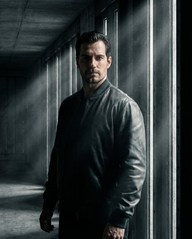 A prompt for generating a stylized mid-shot of a man in a dim underground corridor, using high-contrast lighting where sharp beams of white light cut through drifting dust, partially carving his silhouette. It requires the AI to strictly use an uploaded reference image for the face and maintain a cinematic, futuristic, and moody atmosphere.