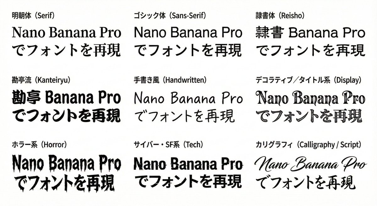 Two prompts demonstrating Nano Banana Pro's advanced text control capabilities, allowing the generation of a single string using multiple specified Japanese and English font styles, and even assigning different fonts to specific words within the string.