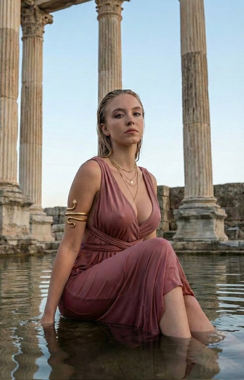 A detailed JSON prompt written primarily in Roman Urdu, designed to generate images of Sydney Sweeney in an Ancient Mythological/Goddess aesthetic. The scene is set in Roman Bath or Temple ruins with golden hour lighting, specifying poses like sitting in water and leaning against a stone pedestal, wearing a silky pink 'Chiton'-style dress and a golden snake armlet.