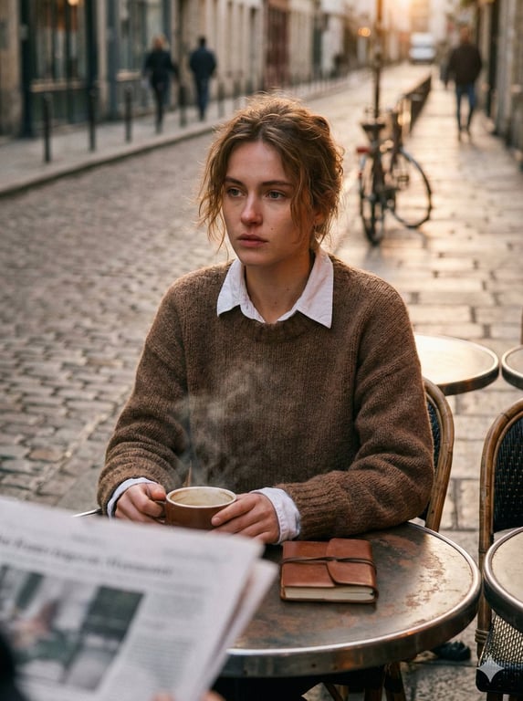 A photorealistic fashion editorial prompt aiming for the introspective, diaristic style of photographer Nan Goldin. It describes a young woman sitting at a street café during sunrise, wearing a white shirt and brown sweater. It emphasizes warm, soft lighting, cinematic grain, imperfect focus, and the emotional realism of a quiet, lived-in moment.