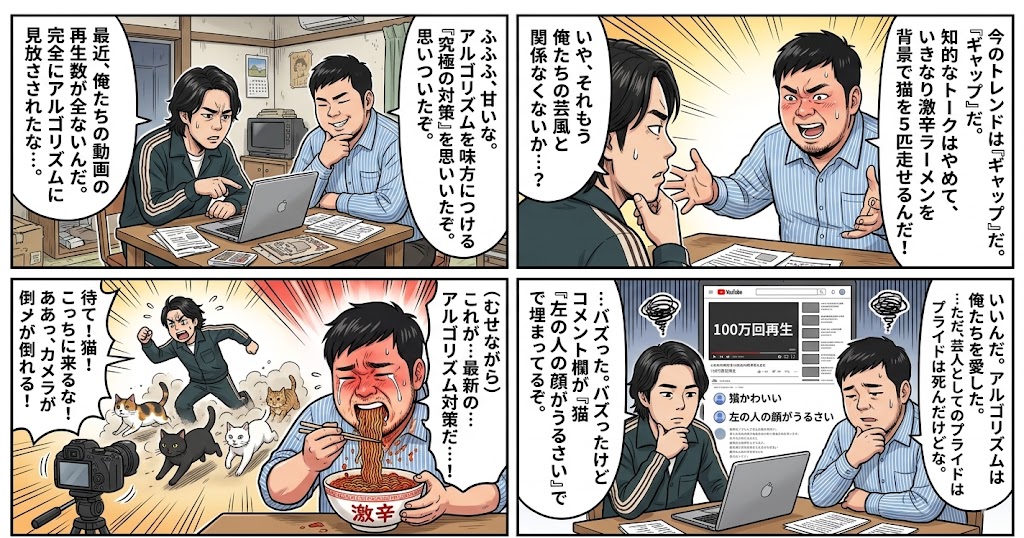 A prompt used to generate a 4-panel manga titled 'The Formula for Buzz' in the style of Reiwa Roman, focusing on algorithm countermeasures and ranking experiments (Sandwich Man, Tokyo 03).