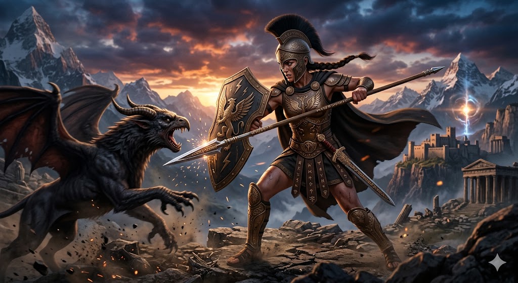 A user shares an image of a mythological warrior generated by Nano Banana Pro (Gemini 3 Pro Image). The prompt was generated by the 'chef' (Gemini) using its own sense and discretion, incorporating elements like the intelligence of Athena, the protection of a Griffin's shield, and confronting chaos (monsters). The prompt is a list of descriptive concepts.