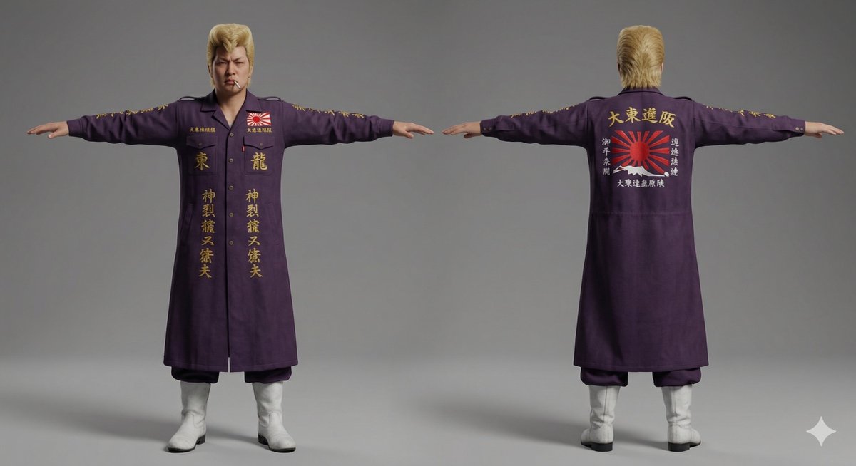 A prompt used with Nano Banana Pro (Google Gemini 3.1 image generator) to create an image of a classic Japanese Bosozoku (male) rendered in the style of a 3D model asset. This is presented as an example of generating AI assets/materials.