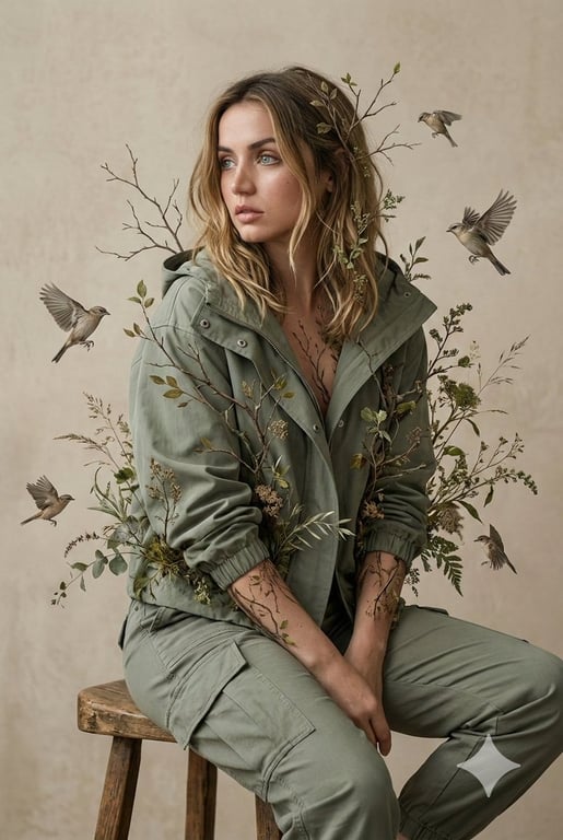 A structured JSON prompt for creating an ultra-realistic, cinematic editorial portrait with a theme of nature-human fusion, featuring a thoughtful subject whose clothing and body seamlessly merge with organic elements like tree branches and foliage.