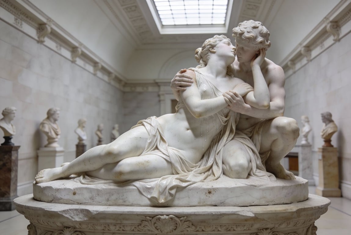 A detailed JSON prompt for generating a photograph of a marble sculpture in the style of 19th-century Neo-Classical or Romantic artists like Canova or Rodin. It specifies the subject (a mythological embrace with wet drapery), the material (Carrara marble with aged patina), the museum gallery setting, and the soft, diffused lighting designed to highlight the stone's texture and form.