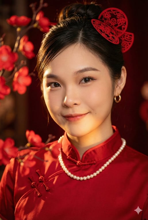 A prompt designed for generating a high-quality commercial portrait of a young East Asian woman in a red Qipao, specifically requiring the model to maintain the facial features of an uploaded reference photo. It emphasizes warm golden hour lighting, high contrast, and a framed composition using red paper-cut art bokeh.