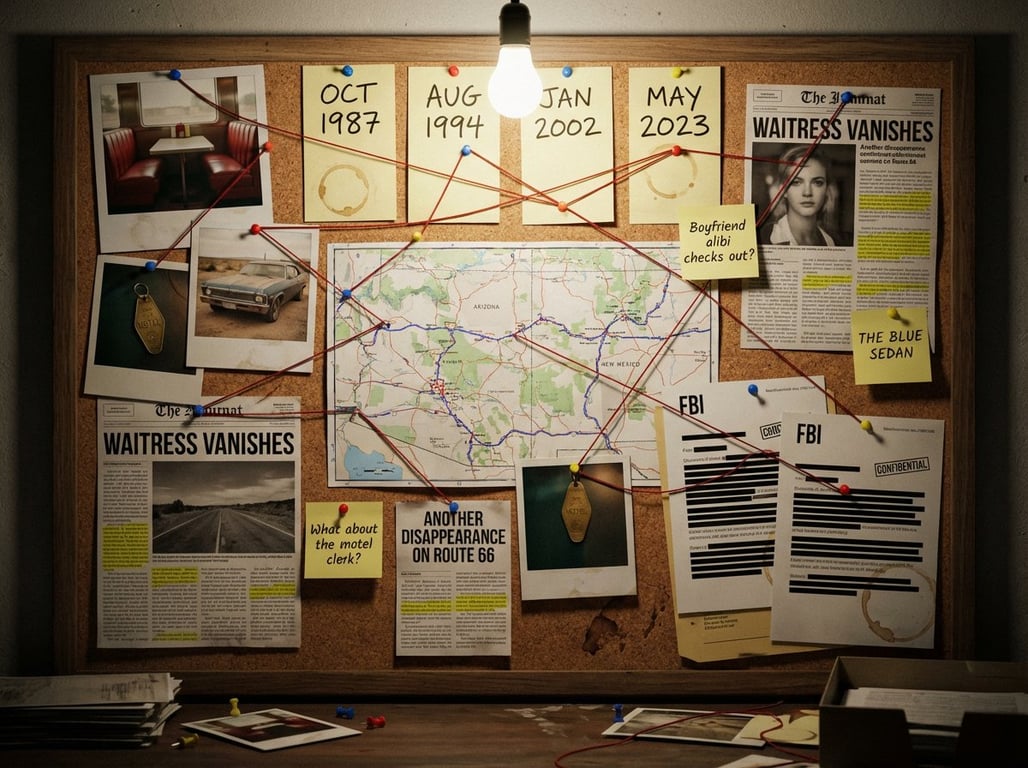 A prompt for generating a photorealistic image of a classic detective's evidence board. It details the composition, including polaroids, maps, newspaper clippings, and red string connecting evidence, all set under dramatic lighting to evoke an obsessive, late-night noir atmosphere.